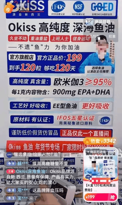 记者从某曲播电商平台采办多款热销的“深海鱼油”,送检后发觉,2款环节功能成分DHA更是未被检出,取宣传存正在庞大差距。“我每次去澳门,城市给我爸买鱼油。”镜头前,粉丝体量接近1500万的博从意白鸽拿着一罐深海鱼油:“今天只需你情愿贡献父母,鸽子宠你们!破价上链接!”Beseem、Drwissth、Moeok、UHUHMI等多个分歧品牌店肆中,这段曲播切片被一次次反复地播放着。同样反复的,还有这四款鱼油链接标注着的“鸽子保举”“白鸽旗舰”“白鸽双11保举”等标签。